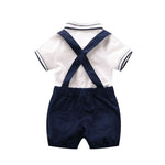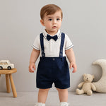 👔 Complete Gentleman Look: Includes short-sleeve romper, navy shorts with suspenders, and navy bow tie.