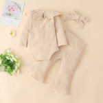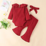 - Set Includes: 3 Pieces- Ruffled romper, flared pants and headband